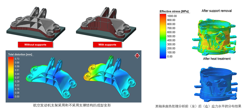 計(jì)算完工后部件的變形并減少/避免變形、最大限度地降低殘余應(yīng)力、優(yōu)化堆積方向、優(yōu)化支撐結(jié)構(gòu)、考察熱處理、基板和支撐結(jié)構(gòu)切除之后部件的狀態(tài)等,從而幫助用戶一次就成功生產(chǎn)出增材制造部件.